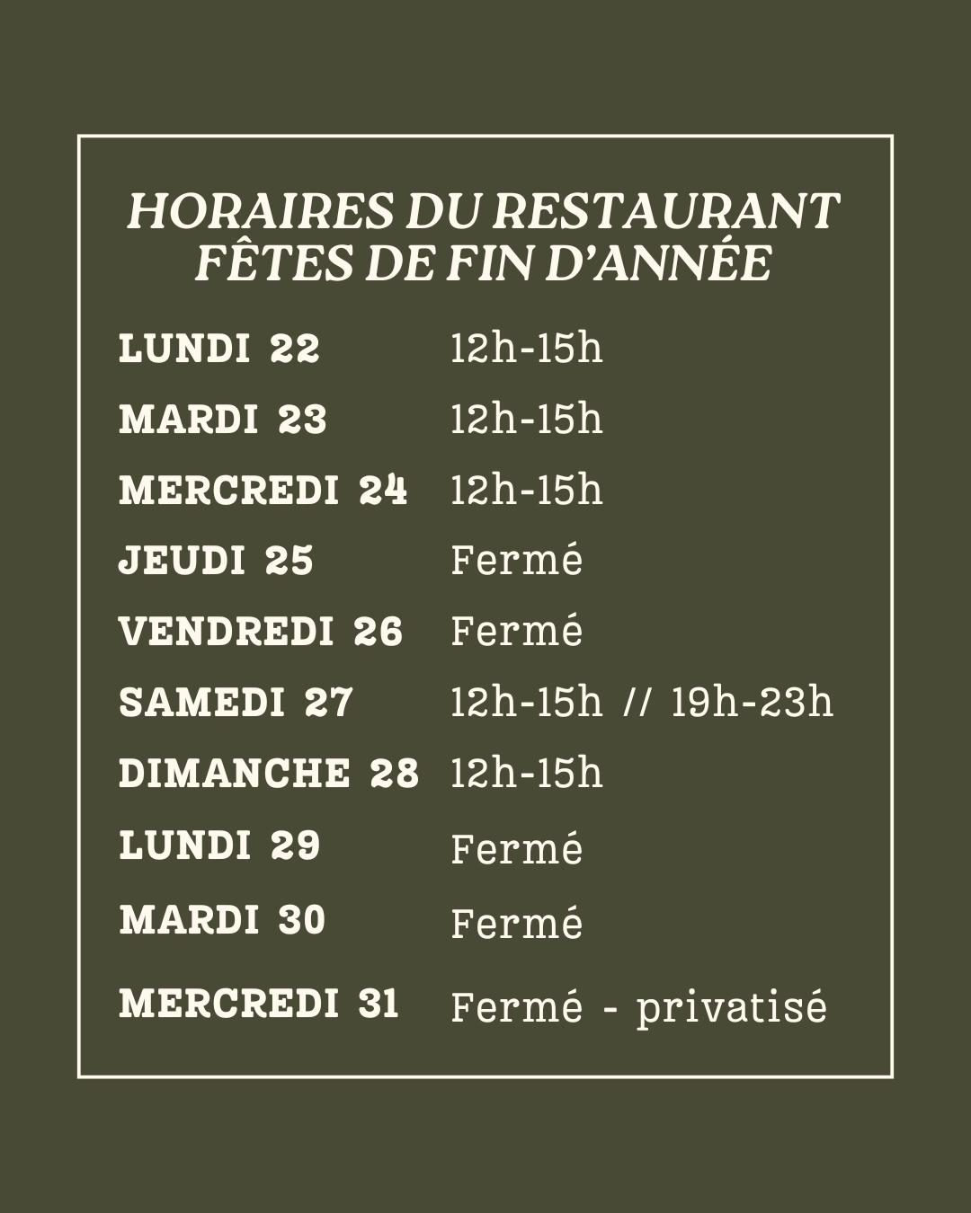 Lundi 12h à 15h - Mardi Fermé - Mercredi 19h à 22h - Jeudi 12h à 15h et 19h à 22h